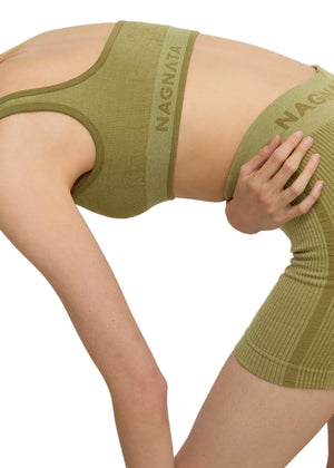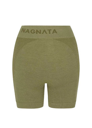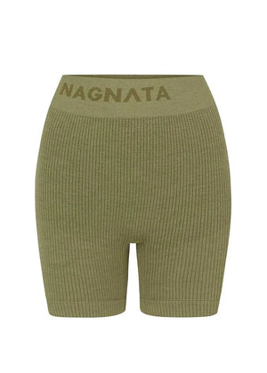 Superfine high-waisted Merino wool seamless knit rib mini short made in our signature seamless fabrication offering mild compression for support and breathability. The style features a double layer waistband with jacquard Nagnata logo on front and back waistband. Crafted in our signature Nagnata rib, these shorts include contrast jacquard stripe placement artwork.